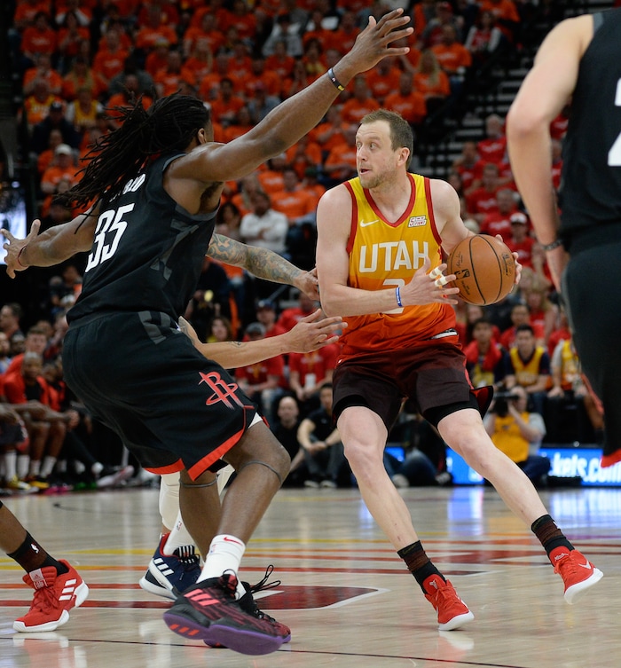 (Francisco Kjolseth | The Salt Lake Tribune) Utah Jazz forward Joe Ingles (2) pressures Houston Rockets guard James Harden (13) in Game 3 of a first-round NBA basketball playoff series in Salt Lake City, Saturday, April 20, 2019.