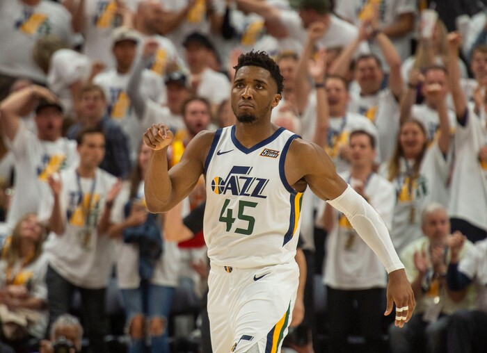 (Rick Egan | The Salt Lake Tribune) Utah Jazz guard Donovan Mitchell (45) congratulates his teammates as the Jazz extend their lead in the second quarter, in NBA Playoffs between the Utah Jazz and the Houston Rockets in Salt Lake City, Monday, April 22, 2019.