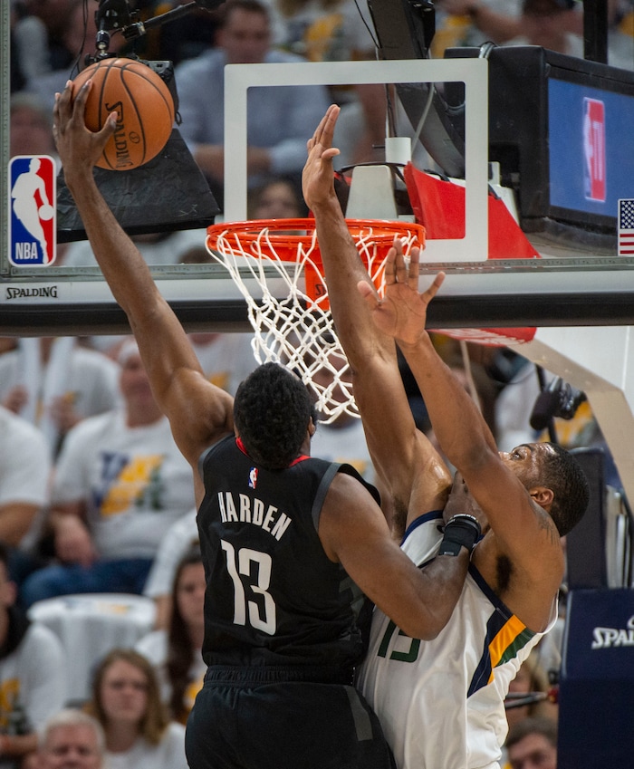 (Rick Egan | The Salt Lake Tribune) Utah Jazz center Rudy Gobert (27) blocks a shot by Houston Rockets guard James Harden (13), in NBA action, in the first round of the NBA Playoffs between the Utah Jazz and the Houston Rockets in Salt Lake City, Monday, April 22, 2019.
