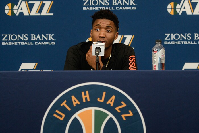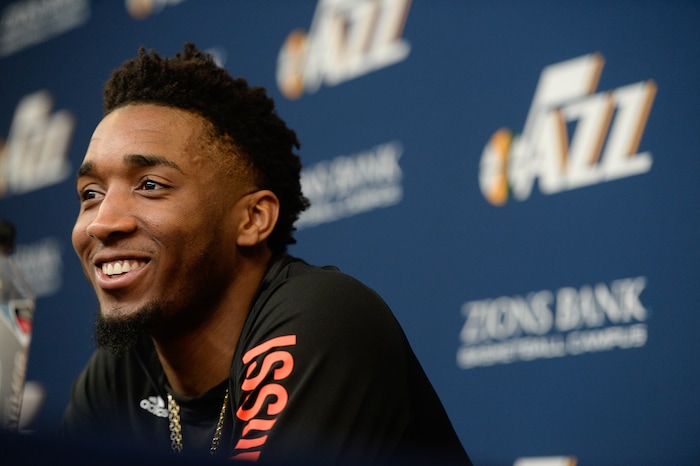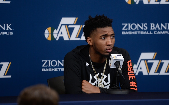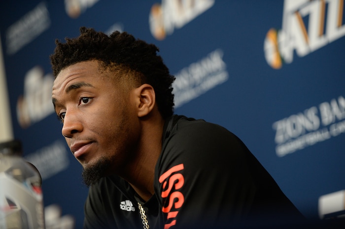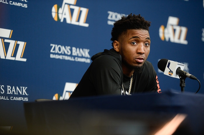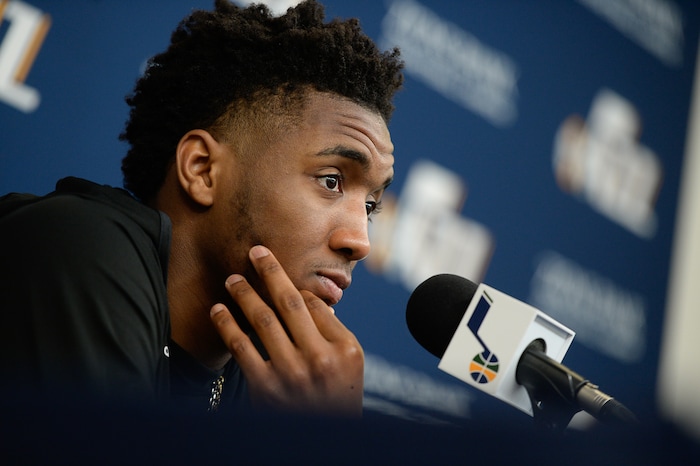 (Francisco Kjolseth | The Salt Lake Tribune) Donovan Mitchell of the Utah Jazz speaks with the media following their season-ending game at the team practice facility on Thursday, April 25. 2019.