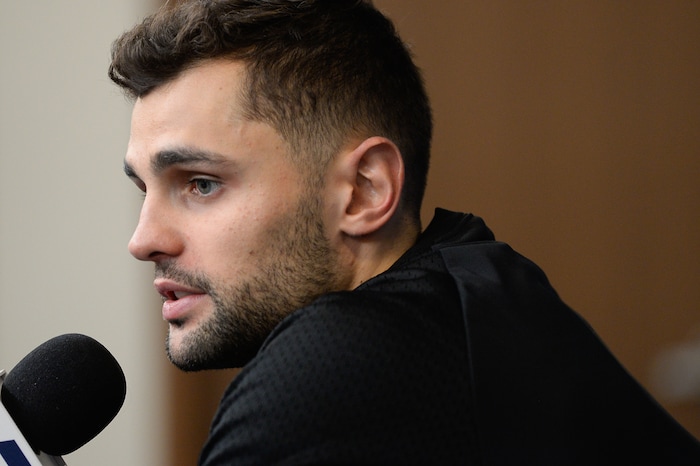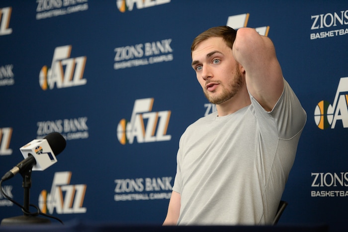 (Francisco Kjolseth | The Salt Lake Tribune) Tyler Cavanaugh of the Utah Jazz speaks with the media following their season-ending game at the team practice facility on Thursday, April 25. 2019.