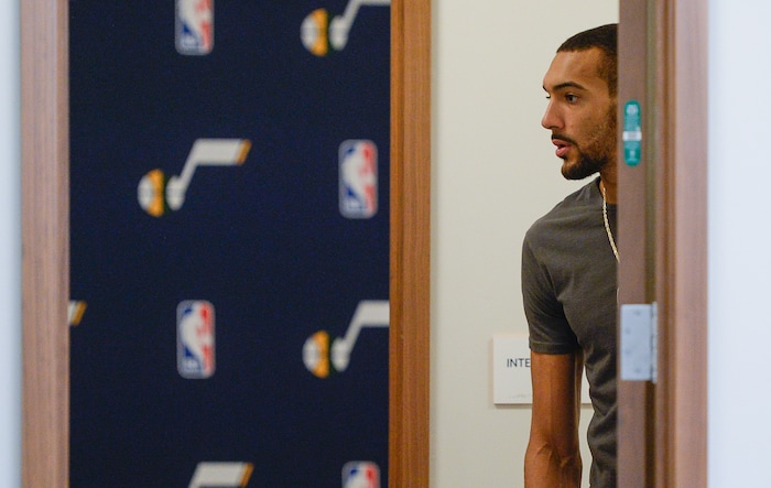 (Francisco Kjolseth | The Salt Lake Tribune) Rudy Gobert of the Utah Jazz gets ready to speak with the media following their season-ending game at the team practice facility on Thursday, April 25. 2019.