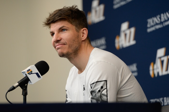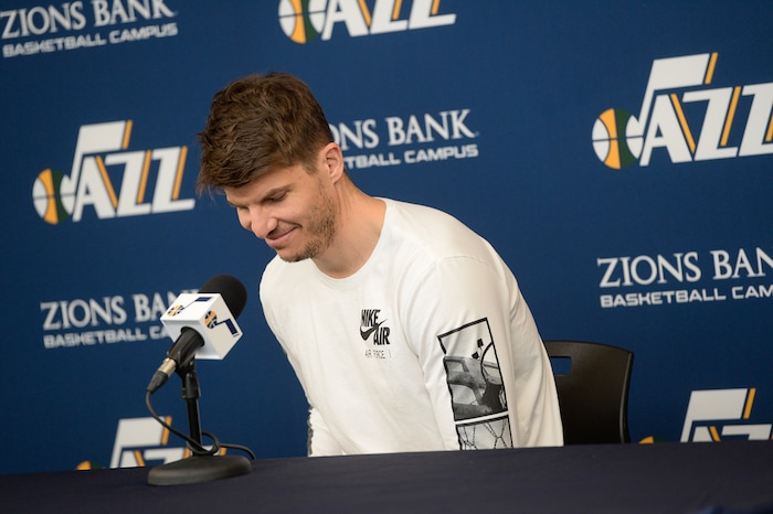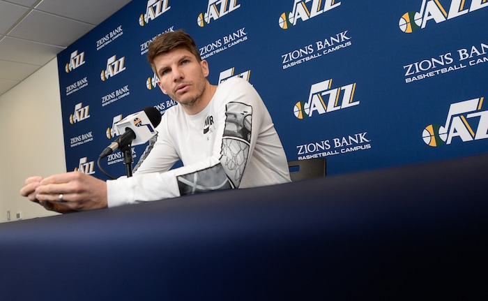 (Francisco Kjolseth | The Salt Lake Tribune) Kyle Korver of the Utah Jazz gets ready to speak with the media following their season-ending game at the team practice facility on Thursday, April 25. 2019.