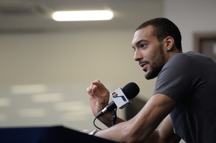 (Francisco Kjolseth | The Salt Lake Tribune) Rudy Gobert of the Utah Jazz speaks with the media following their season-ending game at the team practice facility on Thursday, April 25. 2019.