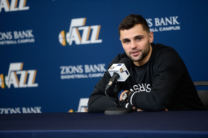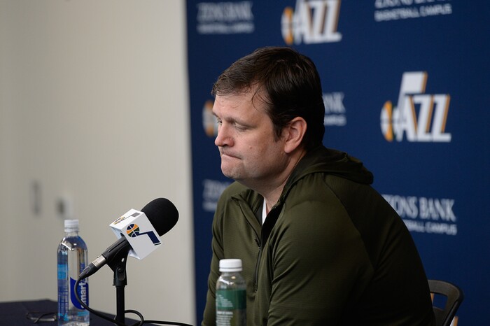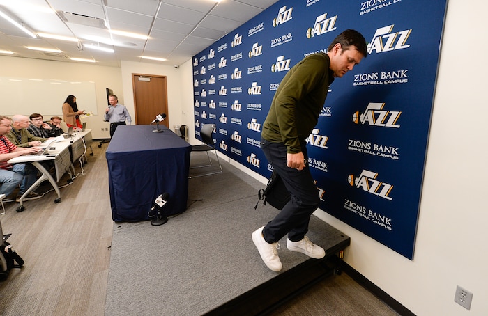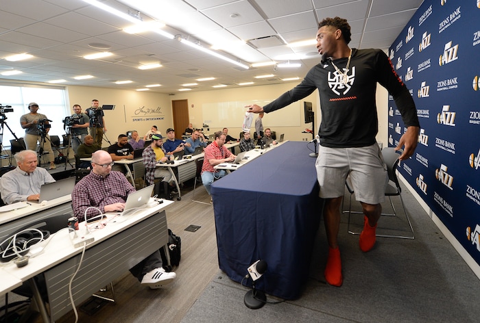 (Francisco Kjolseth | The Salt Lake Tribune) of the Utah Jazz speaks with the media following their season-ending game at the team practice facility on Thursday, April 25. 2019.