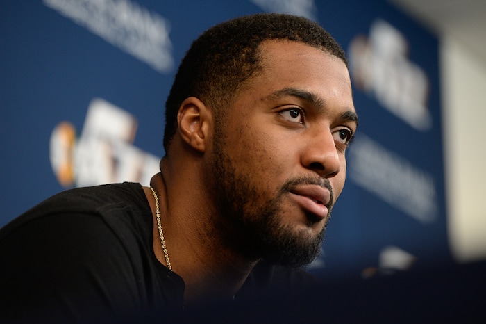 (Francisco Kjolseth | The Salt Lake Tribune) Derrick Favors of the Utah Jazz speaks with the media following their season-ending game at the team practice facility on Thursday, April 25. 2019.
