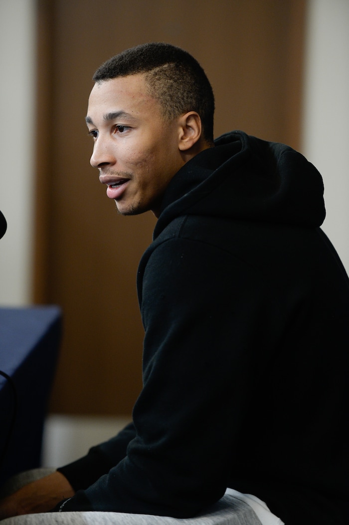 (Francisco Kjolseth | The Salt Lake Tribune) Dante Exum of the Utah Jazz speaks with the media following their season-ending game at the team practice facility on Thursday, April 25. 2019.