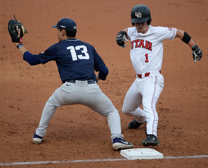 (Francisco Kjolseth | The Salt Lake Tribune) Briley Knight manages to get back to first ahead of Brian Hsu as Utah and BYU renew their rivalry on the baseball diamond as they battle it out at Smith's Ballpark in Salt Lake City on Tuesday, May 14, 2019.