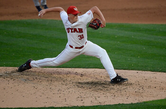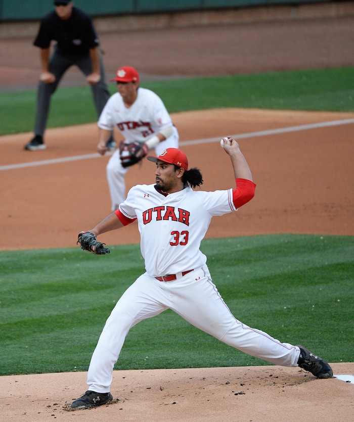 (Francisco Kjolseth | The Salt Lake Tribune) Isaac Deveaux gets a strike as Utah and BYU renew their rivalry on the baseball diamond as they battle it out at Smith's Ballpark in Salt Lake City on Tuesday, May 14, 2019.