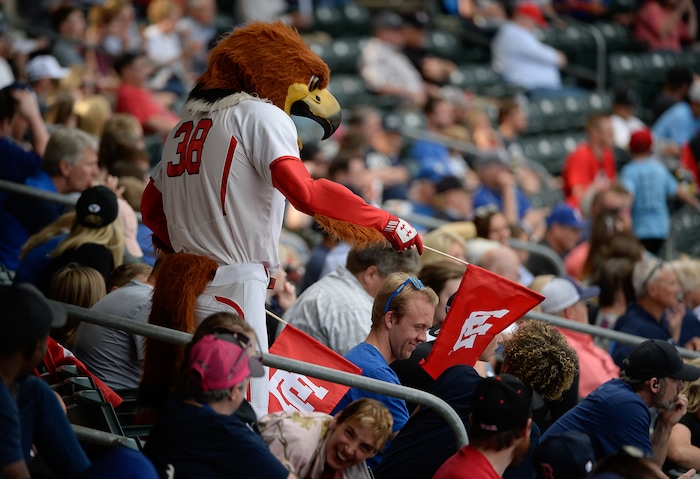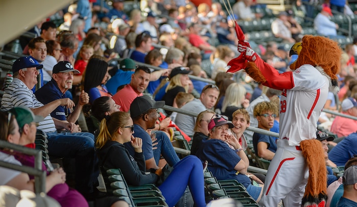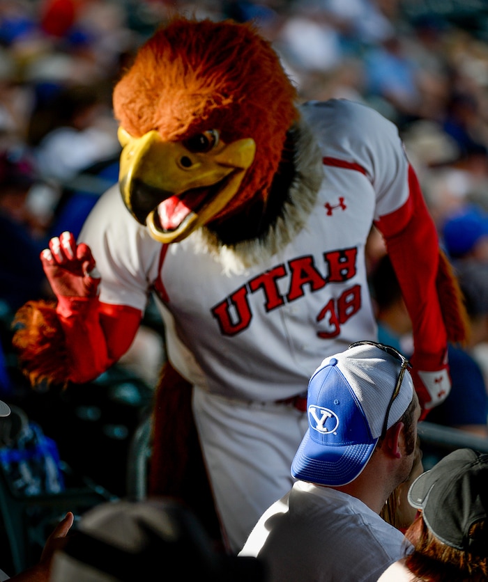 (Francisco Kjolseth | The Salt Lake Tribune) Swoop has a little fun with the BYU fans as Utah and BYU renew their rivalry on the baseball diamond as they battle it out at Smith's Ballpark in Salt Lake City on Tuesday, May 14, 2019.