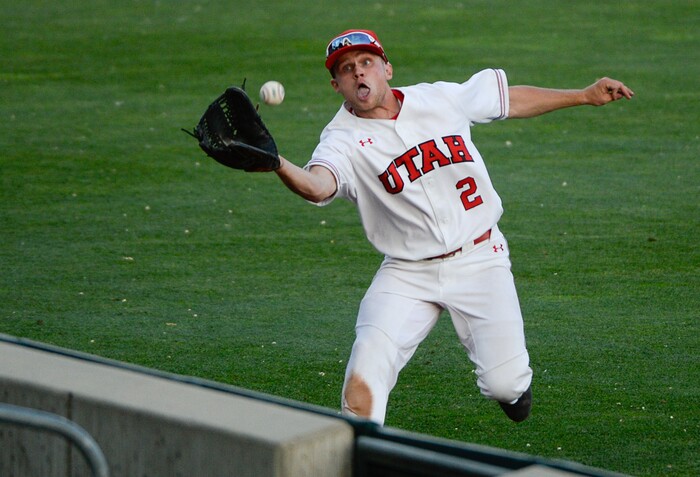 (Francisco Kjolseth | The Salt Lake Tribune) Utah's Zack Moeller gets a fly ball in front of the BYU dugout as Utah and BYU renew their rivalry on the baseball diamond as they battle it out at Smith's Ballpark in Salt Lake City on Tuesday, May 14, 2019.