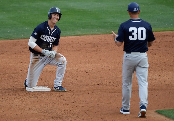 (Francisco Kjolseth | The Salt Lake Tribune) BYU's Brock Hale gets the ball back from the far end of the first base line as Utah and BYU renew their rivalry on the baseball diamond as they battle it out at Smith's Ballpark in Salt Lake City on Tuesday, May 14, 2019.
