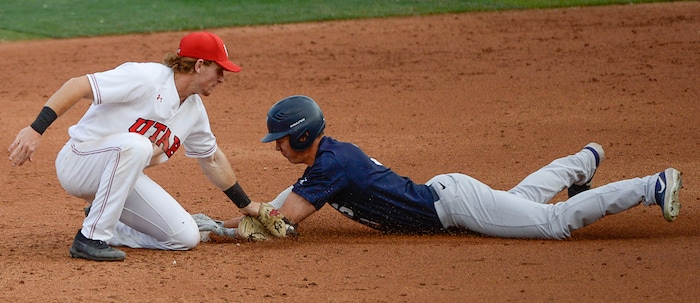 (Francisco Kjolseth | The Salt Lake Tribune) Oliver Dunn denies a second base steal attempt by Danny Gelalich as Utah and BYU renew their rivalry on the baseball diamond as they battle it out at Smith's Ballpark in Salt Lake City on Tuesday, May 14, 2019.