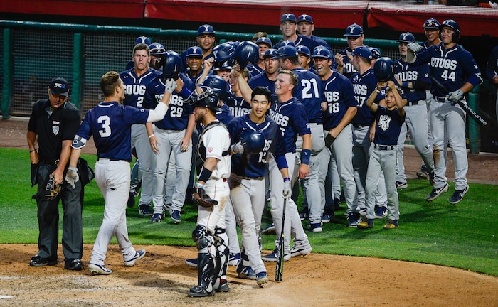 (Francisco Kjolseth | The Salt Lake Tribune) BYU's Danny Gelalich, #3, is celebrated by his teammates as he helps put in the runs as Utah and BYU renew their rivalry on the baseball diamond as they battle it out at Smith's Ballpark in Salt Lake City on Tuesday, May 14, 2019.