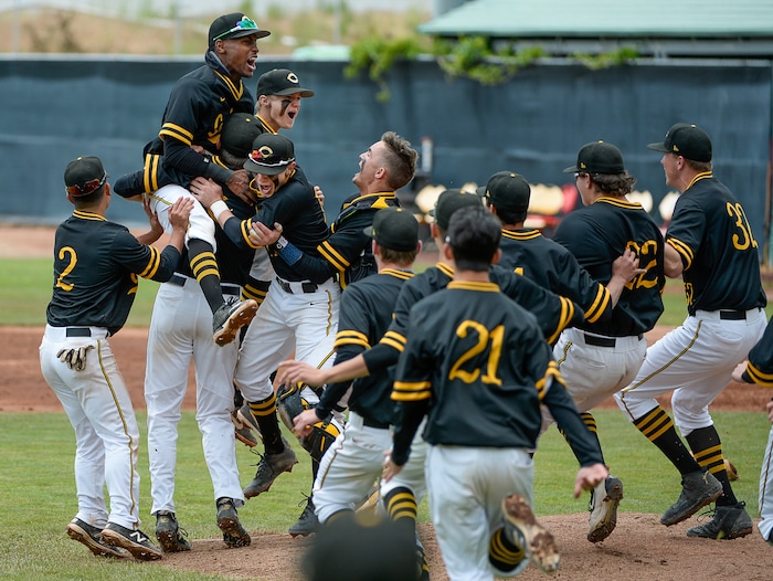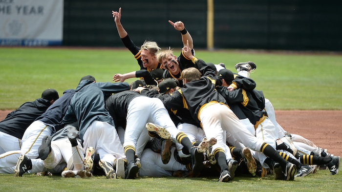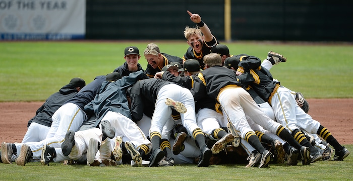 (Francisco Kjolseth | The Salt Lake Tribune) Cottonwood celebrates their 6-5 win over Timpanogos during the 5A baseball championship game at UCCU Stadium on the UVU campus in Orem, Friday, May 24, 2019.