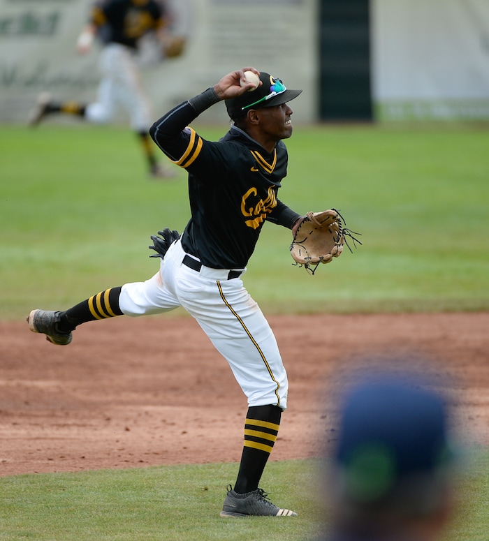 (Francisco Kjolseth | The Salt Lake Tribune) Daniel Gonzales of Cottonwood makes a play to first base against Timpanogos during the 5A baseball championship game at UCCU Stadium on the UVU campus in Orem, Friday, May 24, 2019.