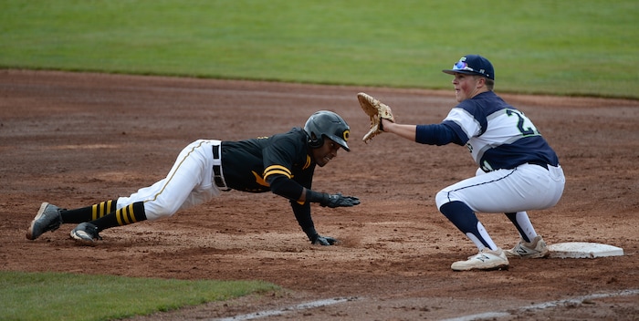 (Francisco Kjolseth | The Salt Lake Tribune) Paxton Richards of Timpanogos keeps ready as Andy Okamoto of Cottonwood beats the ball at first during the 5A baseball championship game at UCCU Stadium on the UVU campus in Orem, Friday, May 24, 2019.