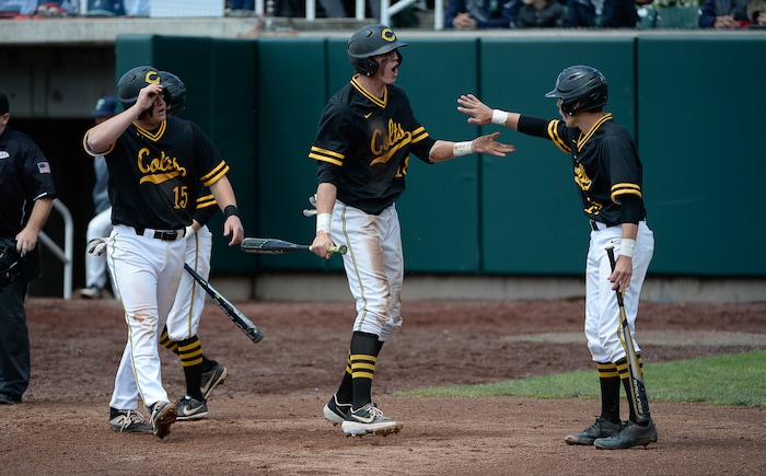 (Francisco Kjolseth | The Salt Lake Tribune) Cottonwood's Dylan Reiser, right, celebrates a run with teammates during the 5A baseball championship game at UCCU Stadium on the UVU campus in Orem, Friday, May 24, 2019.
