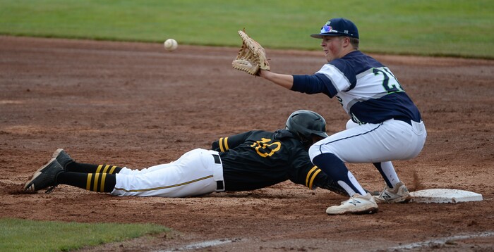 (Francisco Kjolseth | The Salt Lake Tribune) Cottonwood's Cade Perkins comes up short at first as Paxton Richards of Timpanogos pulls in the catch during the 5A baseball championship game at UCCU Stadium on the UVU campus in Orem, Friday, May 24, 2019.