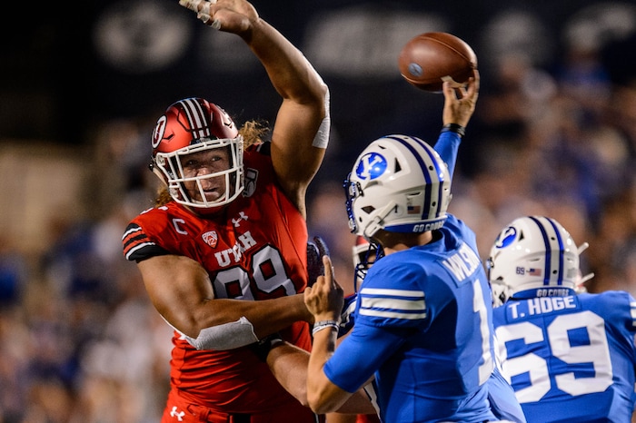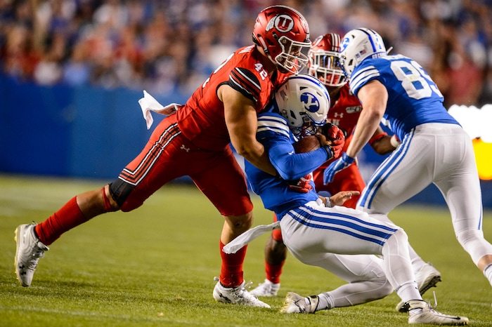 Utah Utes defensive end Mika Tafua (42) brings down Brigham Young Cougars quarterback Zach Wilson (1) as Brigham Young University (BYU) hosts the University of Utah, NCAA football in Provo on Thursday Aug. 29, 2019.
