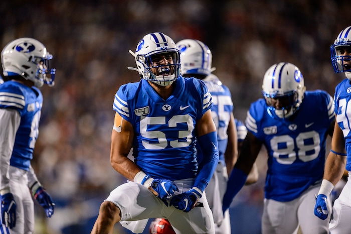 Brigham Young Cougars linebacker Isaiah Kaufusi (53) celebrates a sack as Brigham Young University (BYU) hosts the University of Utah, NCAA football in Provo on Thursday Aug. 29, 2019.