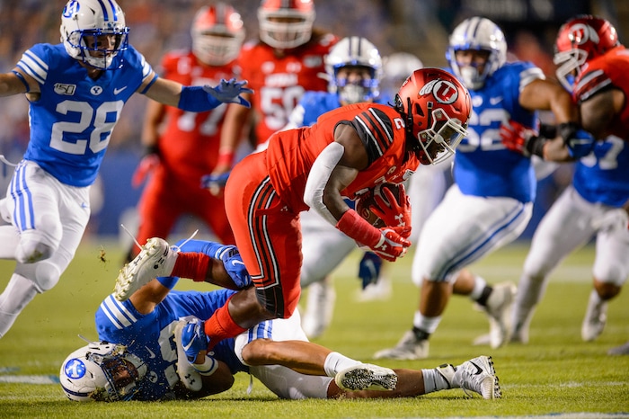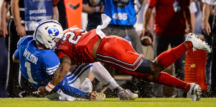 Utah Utes defensive back Julian Blackmon (23) dives into Brigham Young Cougars quarterback Zach Wilson (1) as Brigham Young University (BYU) hosts the University of Utah, NCAA football in Provo on Thursday Aug. 29, 2019.