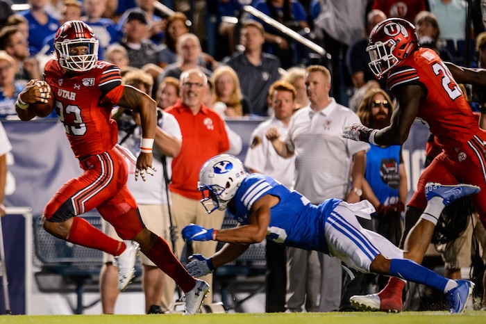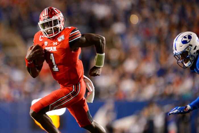 Utah Utes quarterback Tyler Huntley (1) runs the ball as Brigham Young University (BYU) hosts the University of Utah, NCAA football in Provo on Thursday Aug. 29, 2019.