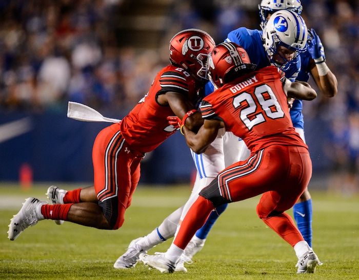 Utah Utes defensive back Terrell Burgess (26) and Utah Utes defensive back Javelin Guidry (28) converge on Brigham Young Cougars tight end Matt Bushman (89) as Brigham Young University (BYU) hosts the University of Utah, NCAA football in Provo on Thursday Aug. 29, 2019.