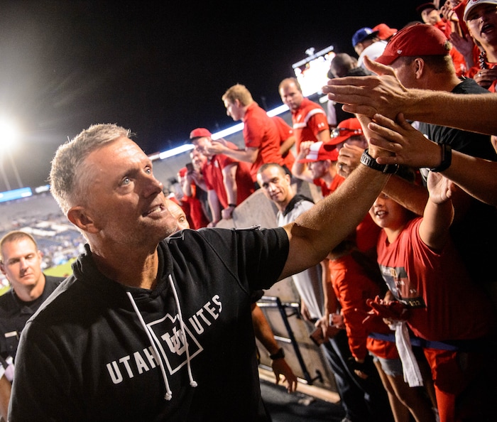 Utah coach Kyle Whittingham high-fives fans after the win, as Brigham Young University (BYU) hosts the University of Utah, NCAA football in Provo on Friday Aug. 30, 2019.