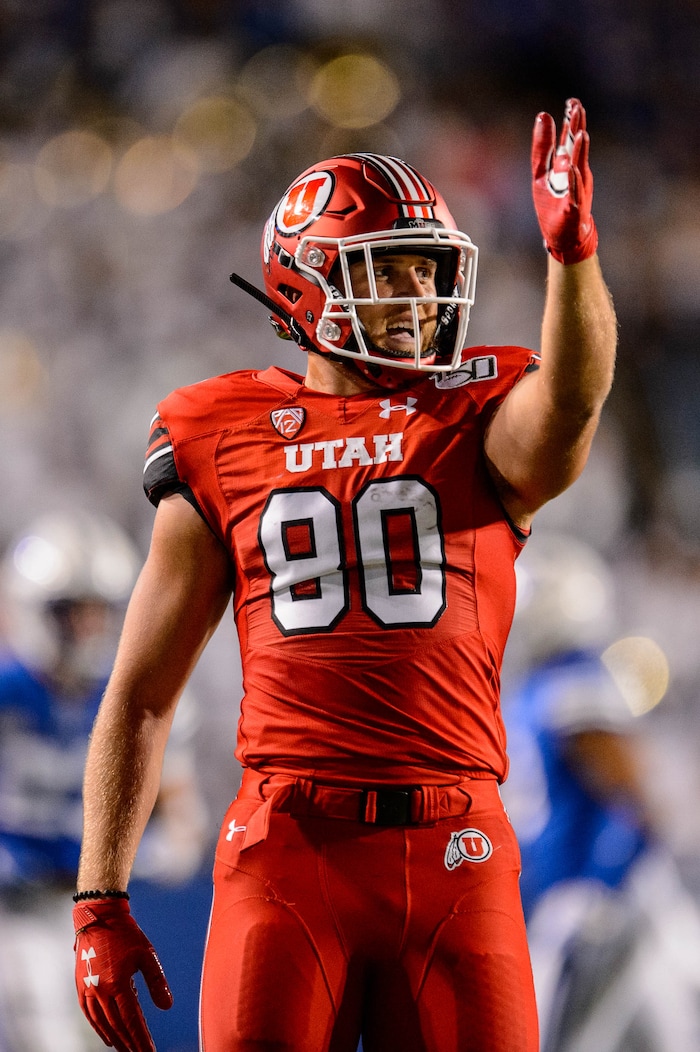 Utah Utes tight end Brant Kuithe (80) signals a first down after a completion as Brigham Young University (BYU) hosts the University of Utah, NCAA football in Provo on Thursday Aug. 29, 2019.