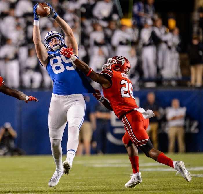 Brigham Young Cougars tight end Matt Bushman (89) pulls in a pass ahead of Utah Utes defensive back Terrell Burgess (26) as Brigham Young University (BYU) hosts the University of Utah, NCAA football in Provo on Thursday Aug. 29, 2019.