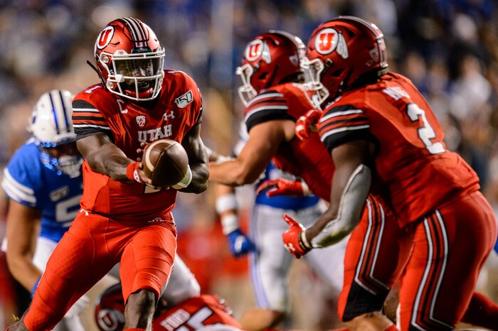 Utah Utes quarterback Tyler Huntley (1) hands off to Utah Utes running back Zack Moss (2) as Brigham Young University (BYU) hosts the University of Utah, NCAA football in Provo on Thursday Aug. 29, 2019.