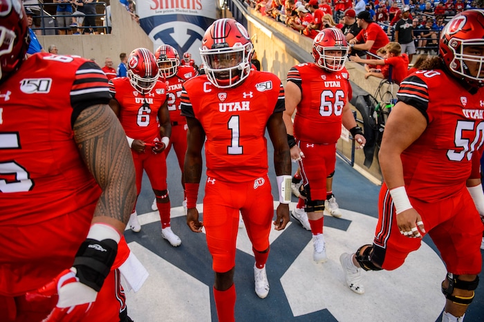 ;Utah Utes quarterback Tyler Huntley (1) enters the stadium as Brigham Young University (BYU) hosts the University of Utah, NCAA football in Provo on Thursday Aug. 29, 2019.
