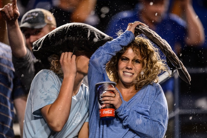 Rain pours down on BYU fans during a lightning delay as Brigham Young University (BYU) hosts the University of Utah, NCAA football in Provo on Thursday Aug. 29, 2019.