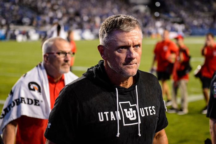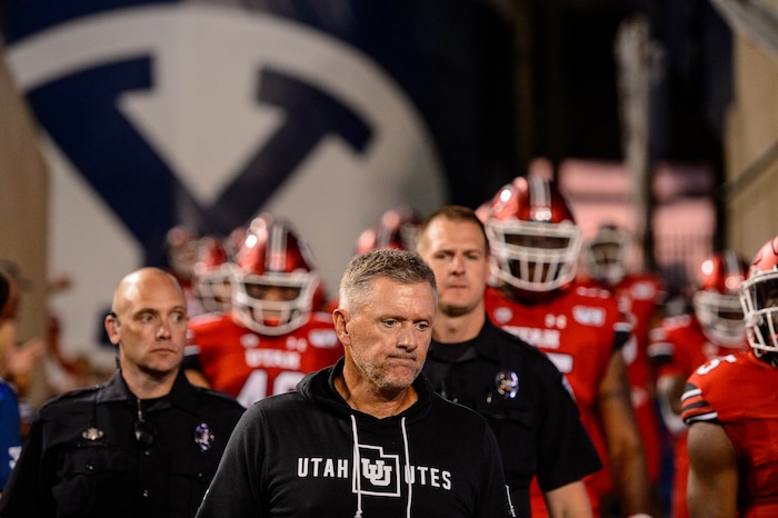 Utah coach Kyle Whittingham as Brigham Young University (BYU) hosts the University of Utah, NCAA football in Provo on Thursday Aug. 29, 2019.