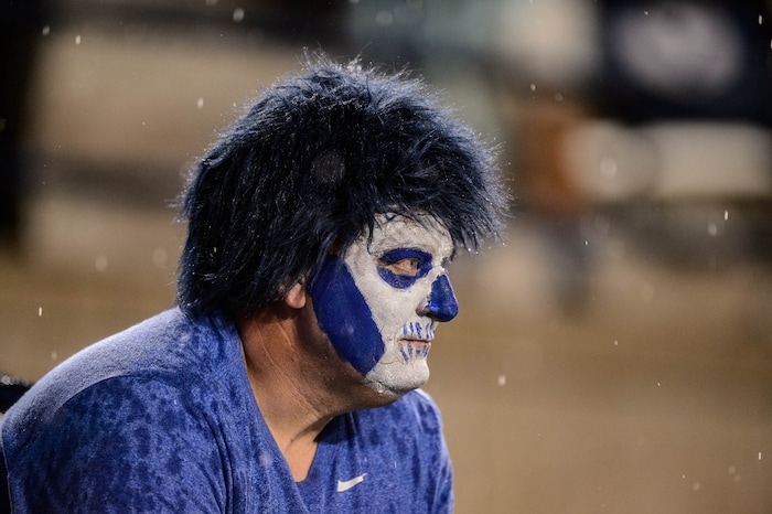 Rain pours down on a BYU fan during a lightning delay as Brigham Young University (BYU) hosts the University of Utah, NCAA football in Provo on Thursday Aug. 29, 2019.