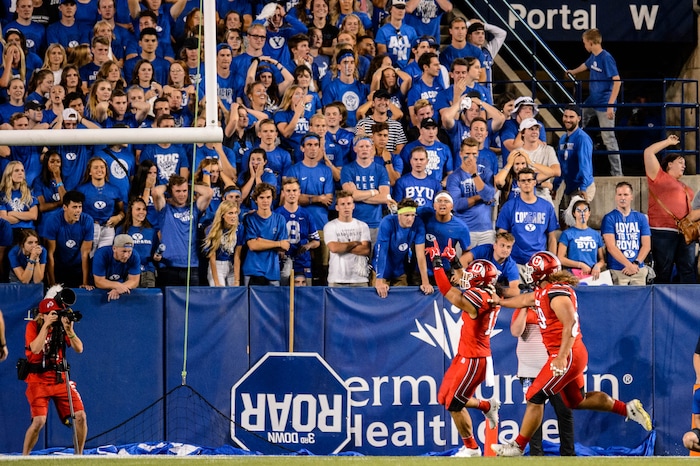 Utah players celebrate the win as Brigham Young University (BYU) hosts the University of Utah, NCAA football in Provo on Friday Aug. 30, 2019.