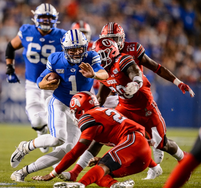 Brigham Young Cougars quarterback Zach Wilson (1) runs the ball as Brigham Young University (BYU) hosts the University of Utah, NCAA football in Provo on Thursday Aug. 29, 2019.