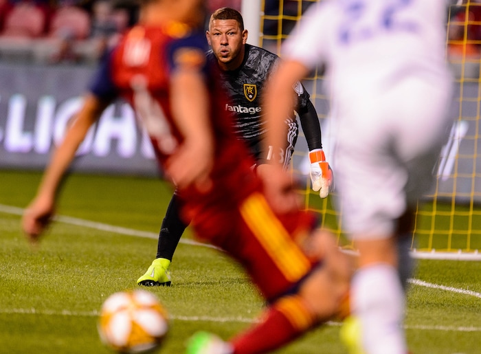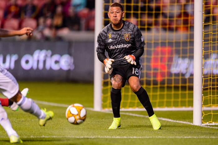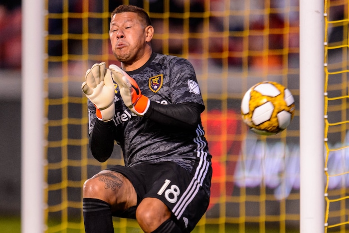 Real Salt Lake goalkeeper Nick Rimando (18) as Real Salt Lake hosts the San Jose Earthquakes, MLS soccer at Rio Tinto Stadium in Sandy on Wednesday Sept. 11, 2019.