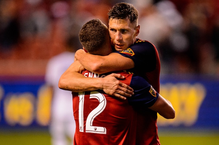 Real Salt Lake forward Brooks Lennon (12) and Real Salt Lake midfielder Damir Kreilach (8) embrace after the game as Real Salt Lake hosts the San Jose Earthquakes, MLS soccer at Rio Tinto Stadium in Sandy on Wednesday Sept. 11, 2019.