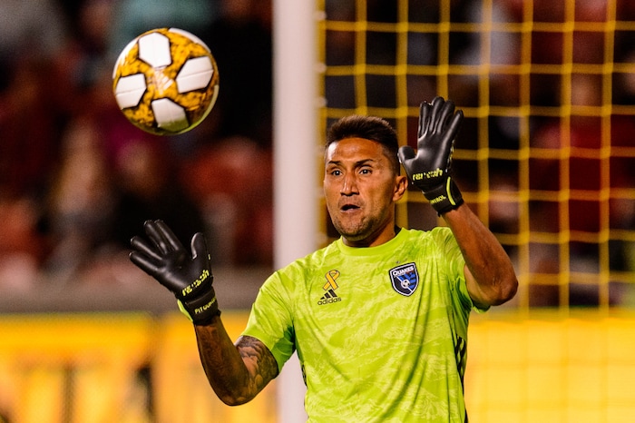 San Jose Earthquakes goalkeeper Daniel Vega (17) makes a save as Real Salt Lake hosts the San Jose Earthquakes, MLS soccer at Rio Tinto Stadium in Sandy on Wednesday Sept. 11, 2019.