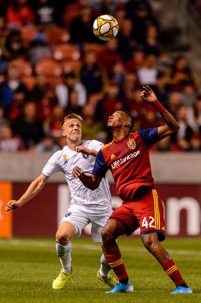 San Jose Earthquakes forward Tommy Thompson (22) and Real Salt Lake's Douglas Martinez as Real Salt Lake hosts the San Jose Earthquakes, MLS soccer at Rio Tinto Stadium in Sandy on Wednesday Sept. 11, 2019.