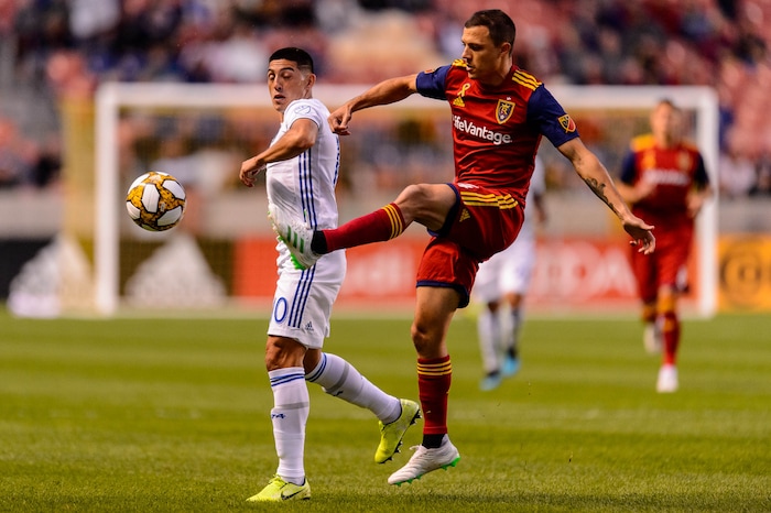 San Jose Earthquakes forward Cristian Espinoza (10) and Real Salt Lake defender Donny Toia (4) as Real Salt Lake hosts the San Jose Earthquakes, MLS soccer at Rio Tinto Stadium in Sandy on Wednesday Sept. 11, 2019.