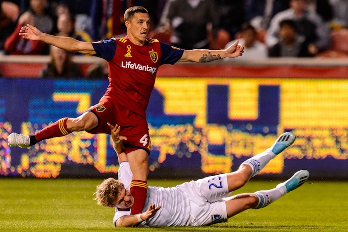 Real Salt Lake defender Donny Toia (4) leaps over San Jose Earthquakes midfielder Florian Jungwirth (23) as Real Salt Lake hosts the San Jose Earthquakes, MLS soccer at Rio Tinto Stadium in Sandy on Wednesday Sept. 11, 2019.