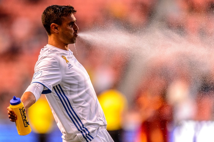 San Jose Earthquakes forward Chris Wondolowski (8) sprays water as he takes the field as Real Salt Lake hosts the San Jose Earthquakes, MLS soccer at Rio Tinto Stadium in Sandy on Wednesday Sept. 11, 2019.