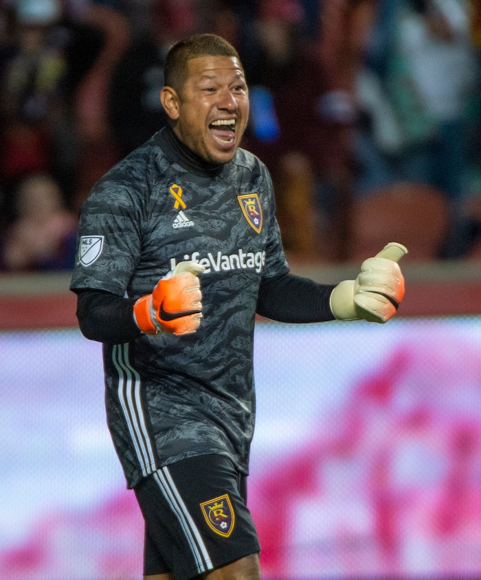 (Rick Egan | The Salt Lake Tribune) Real Salt Lake goalkeeper Nick Rimando (18) reacts as Real Salt Lake defeats the Houston Dynamo 2-1 in his last regular season home game, in MLS soccer action, at Rio Tinto Stadium, Sunday, Sept. 29, 2019.