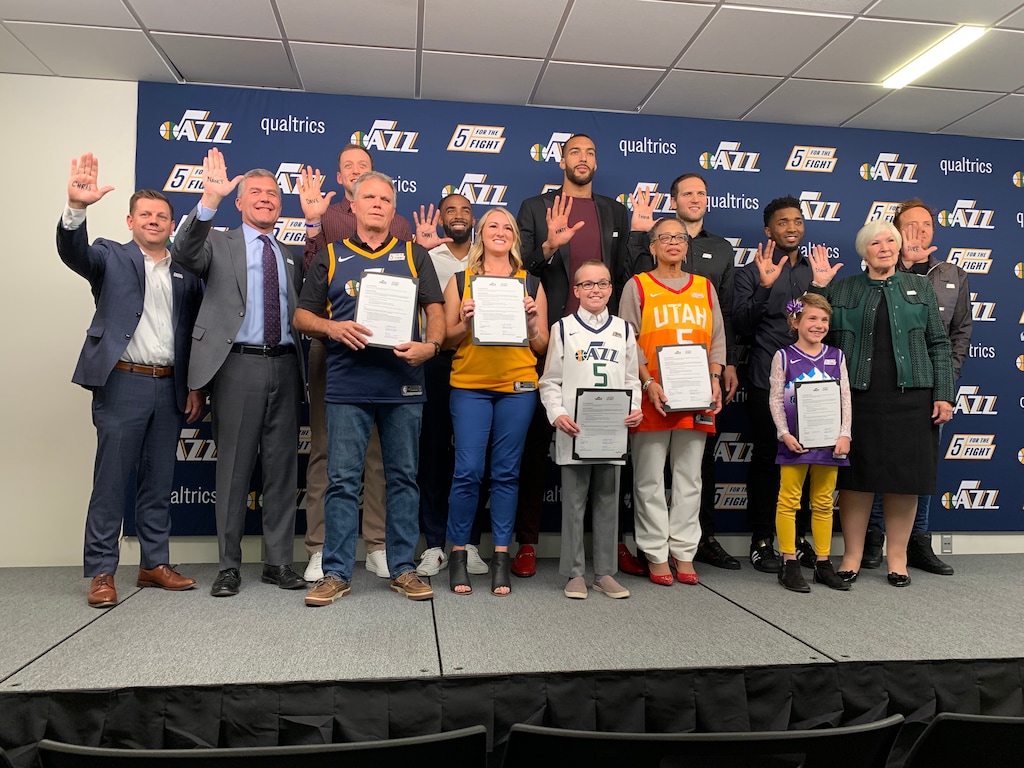 Jazz players Mike Conley, Donovan Mitchell, Bojan Bogdanovic, Joe Ingles and Rudy Gobert were present for the announcement. Each was paired with one of five “cancer fighters" who will be honored at the Jazz game on Oct. 30, representing the cancer community. Each signed a ceremonial $5 deal with the Jazz on Monday afternoon.