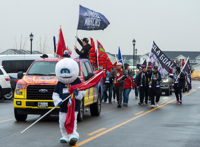 (Rick Egan | The Salt Lake Tribune) The Real Monarchs supporters celebrate the Monarch's USL Cup Championship, during their championship parade at Lynn Crane Park in Herriman, Wednesday, Nov. 20, 2019