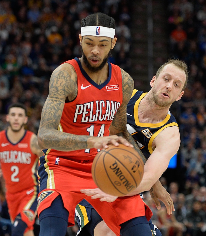 (Francisco Kjolseth | The Salt Lake Tribune) Utah Jazz forward Joe Ingles (2) reaches in for the ball against New Orleans Pelicans forward Brandon Ingram (14) as the Utah Jazz host the New Orleans Pelicans in their NBA basketball game at Vivint Smart Home Arena in Salt Lake City on Sat. Nov. 23, 2019.
