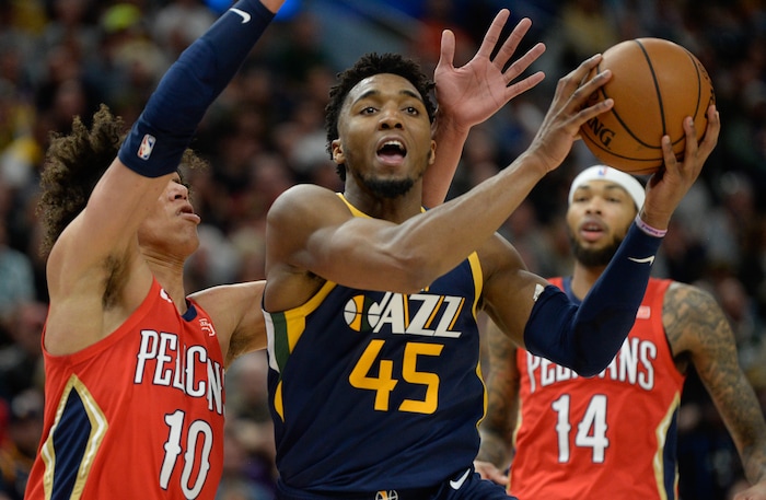 (Francisco Kjolseth | The Salt Lake Tribune) Utah Jazz guard Donovan Mitchell (45) as the Utah Jazz host the New Orleans Pelicans in their NBA basketball game at Vivint Smart Home Arena in Salt Lake City on Sat. Nov. 23, 2019.